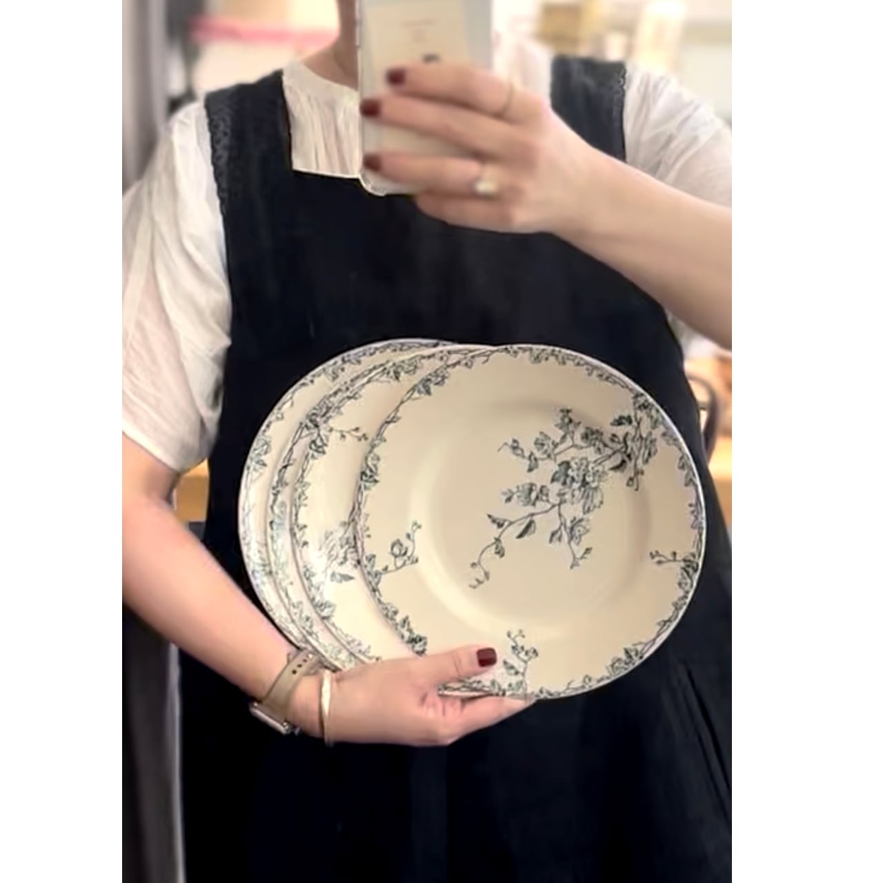 こちらは、アイボリーの温かな土台に、紺色の一色で繊細に描かれた植物のデザインが印象的。