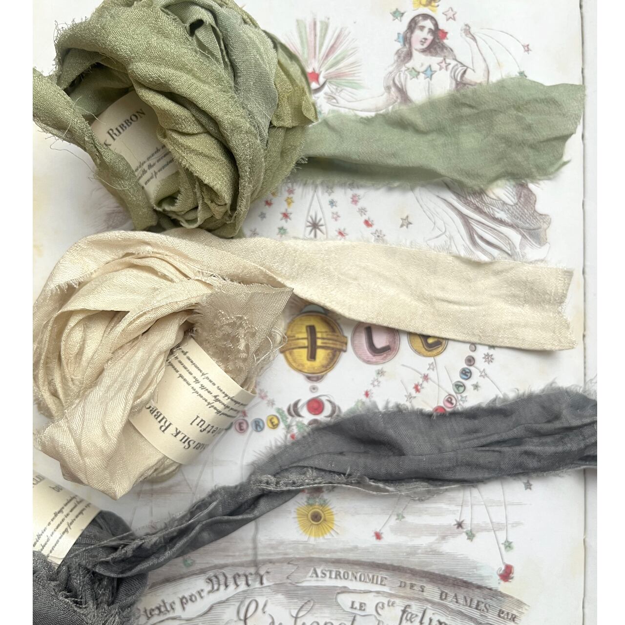 【リサイクル サリー シルク リボン セット】ブルーグレー+アイボリー+グリーン 3色セット/合計7.5m/Recycled Sari Silk Ribbon/ハンドメイド素材に◎