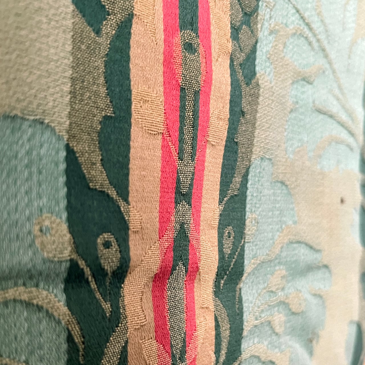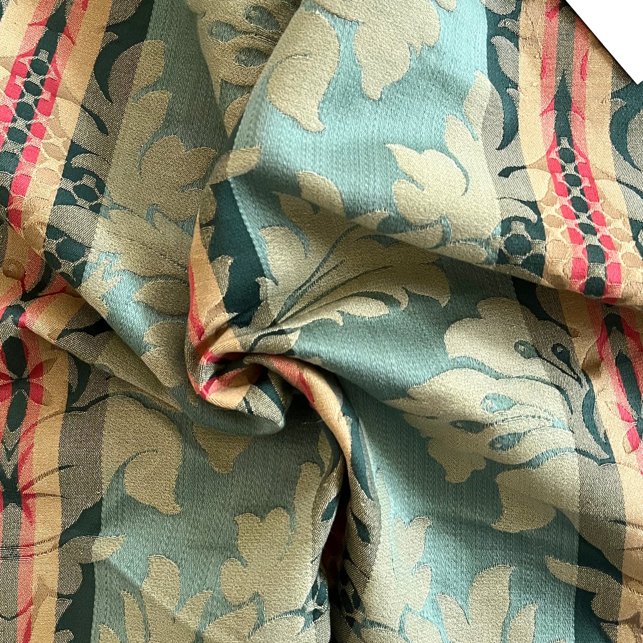 グリーンカラーをベースに、ダークピンクやダークグリーンのストライプが織り込まれ、華やかさと落ち着きを兼ね備えた色使いが印象的。大きめの柄と繊細な織り模様がさらに美しく見せてくれます。お部屋のアクセントとしてファブリックパネルに仕立てるのはもちろん、クッションカバーやバッグの一部として使っても映えるデザイン。