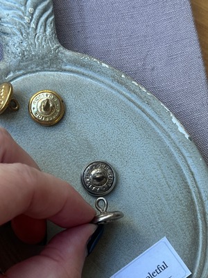 Rのモノグラムが入ったシルバーカラーのイニシャル入りボタン。何かのユニフォーム用だったと聞きました。