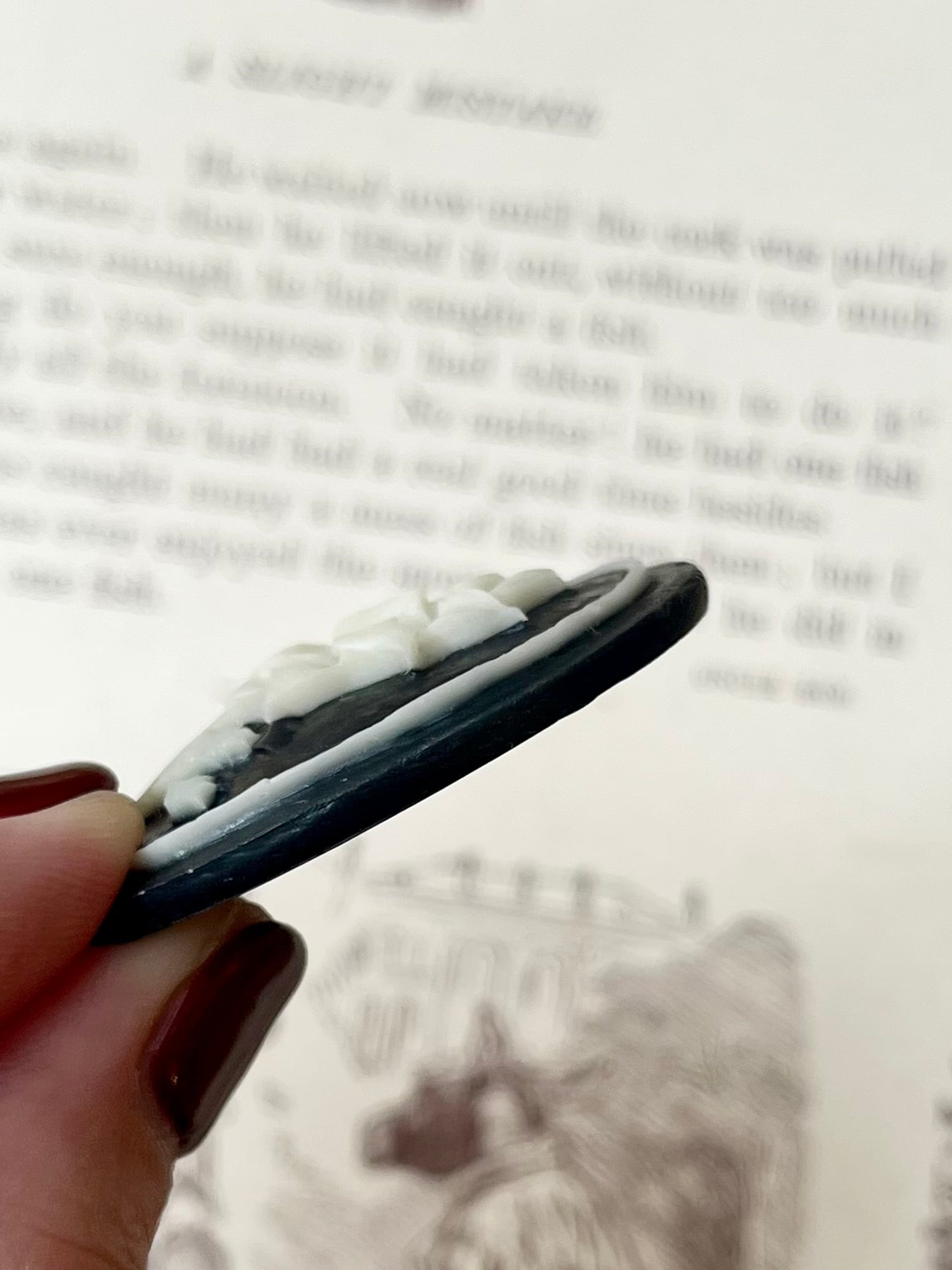 1960年代の存在感あるオーバル型カボション。マットなブラックの背景に、立体感のある大輪の白い花が一輪咲くインパクトあるデザインです。表面は艶がなくマットな仕上がりで、ハンドメイド風の素朴な質感がより温かく感じられます。ペンダントトップやチャーム、ブローチなど、個性的なアクセサリー作りにぴったりの一点です。