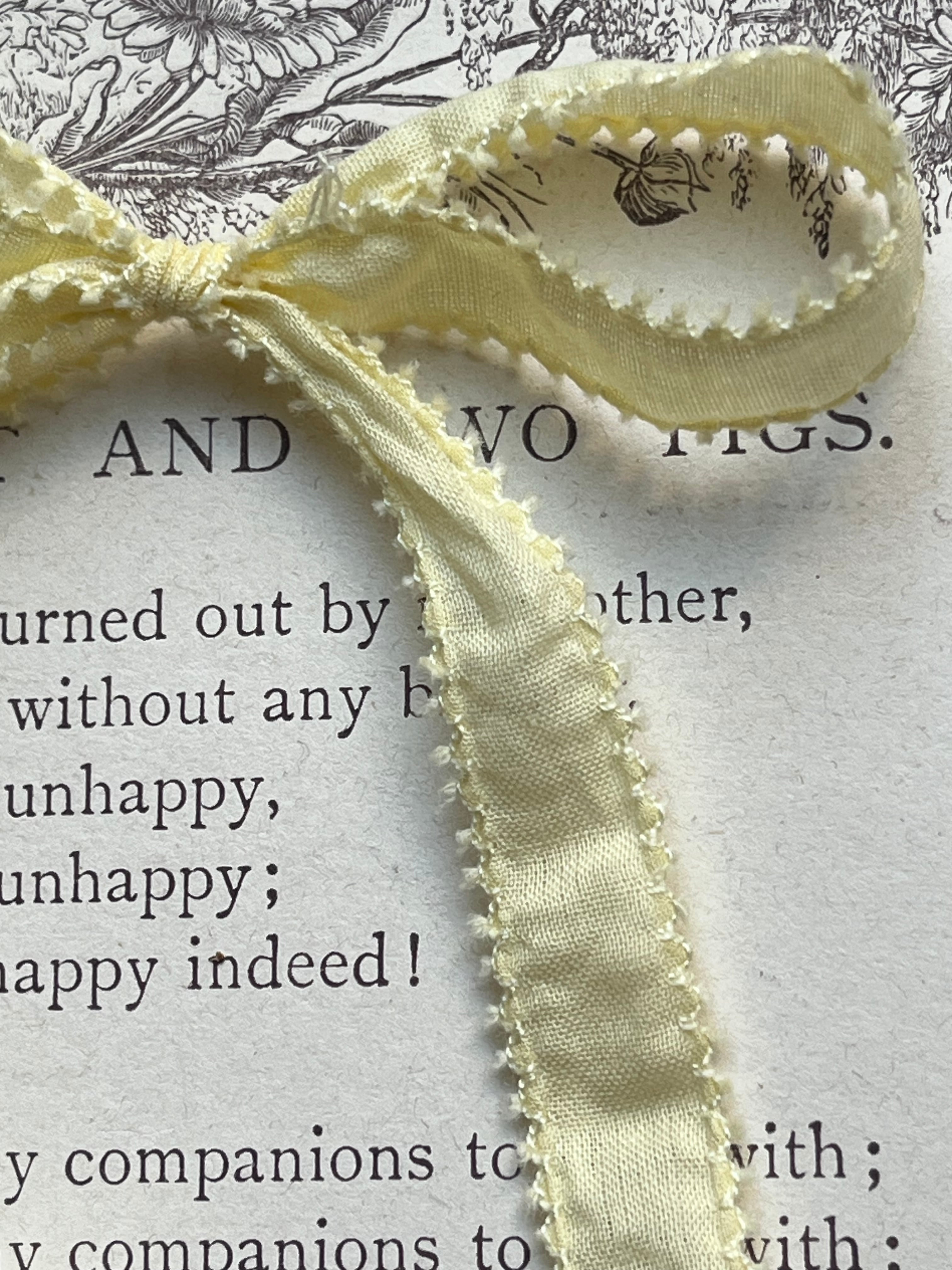 さらりとしたコットン製のリボン。両サイドには可憐なピコかがりが施され、レースのような繊細さと、中央部分にゆらぎのある柔らかな凹凸の表情が生まれます。ギフトラッピングやメッセージカード、ハンドメイド作品の装飾にぴったり。さらに、ヘアアレンジ用のリボンとしても上品に映え、シンプルながらも可憐で洗練された雰囲気を添えてくれます。