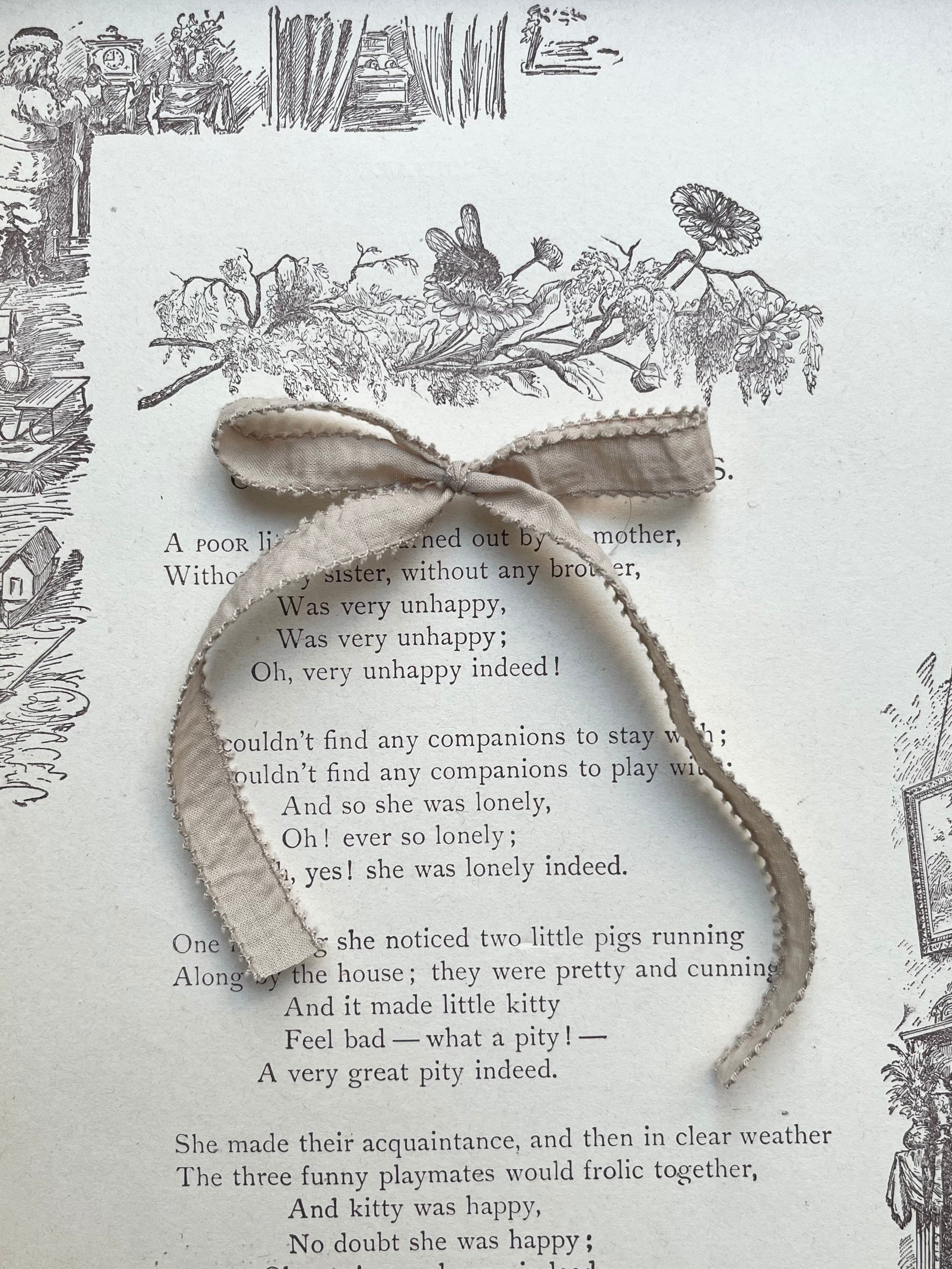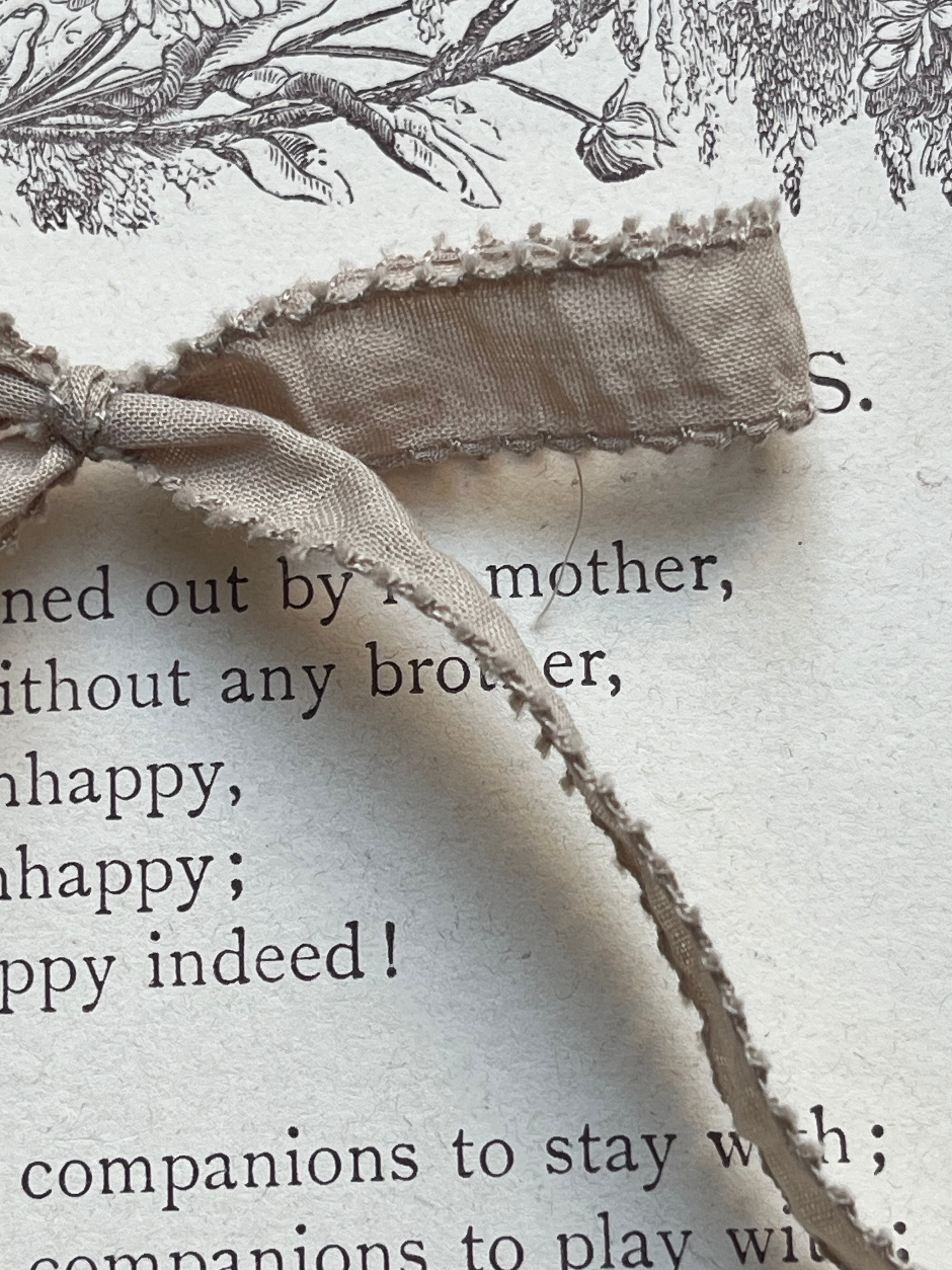 さらりとしたコットン製のリボン。両サイドには可憐なピコかがりが施され、レースのような繊細さと、中央部分にゆらぎのある柔らかな凹凸の表情が生まれます。ギフトラッピングやメッセージカード、ハンドメイド作品の装飾にぴったり。さらに、ヘアアレンジ用のリボンとしても上品に映え、シンプルながらも可憐で洗練された雰囲気を添えてくれます。