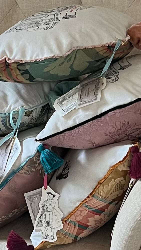 素材は綿麻とヴィンテージ生地を組み合わせ、どちらも時を重ねた風合いを堪能できるよう厳選しました。さらに、高級感漂うベロアのパイピング、ちょっと変わった台形のトップにはベロアのリボンがちょこんとついています。