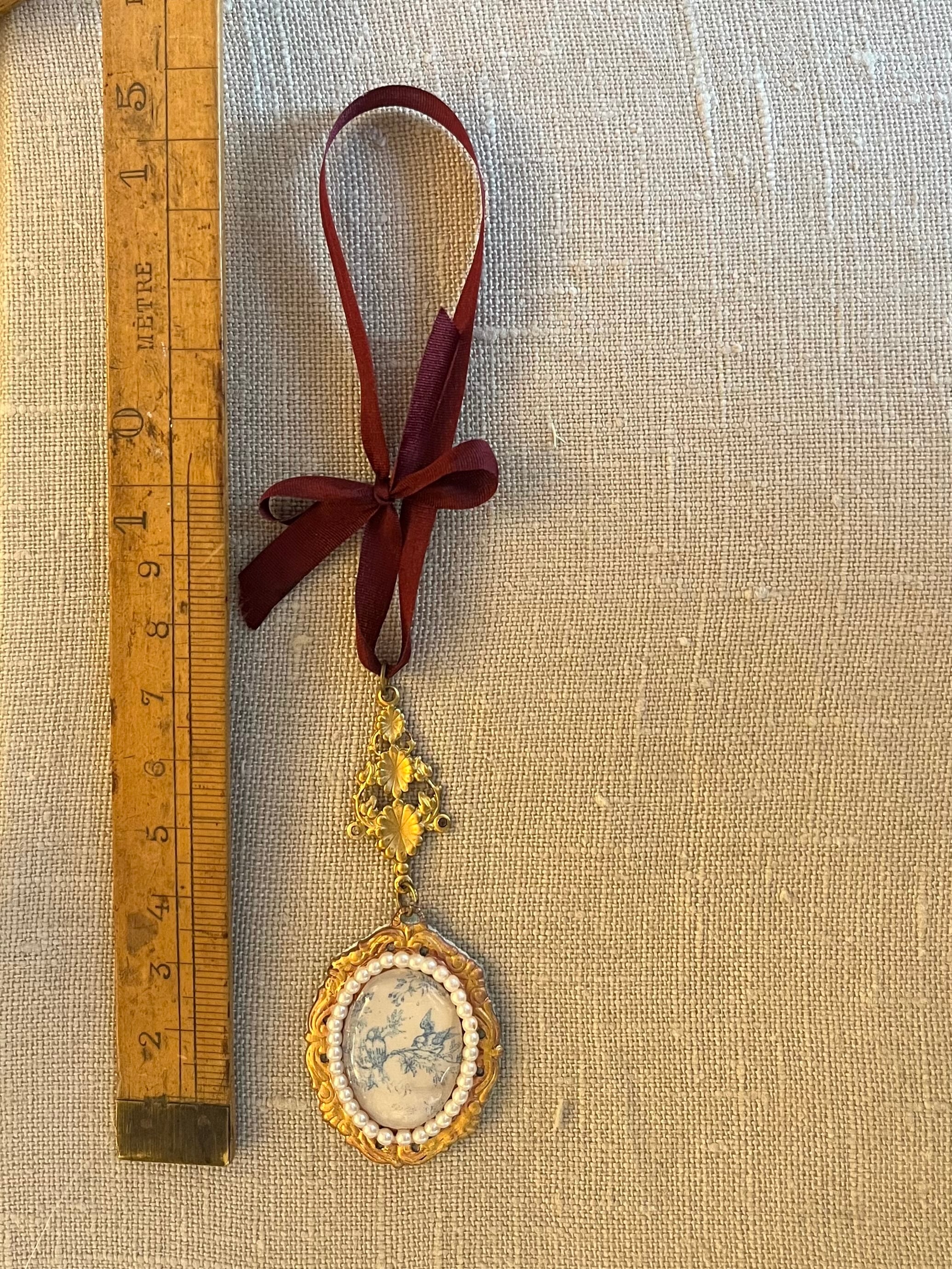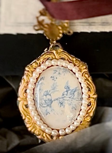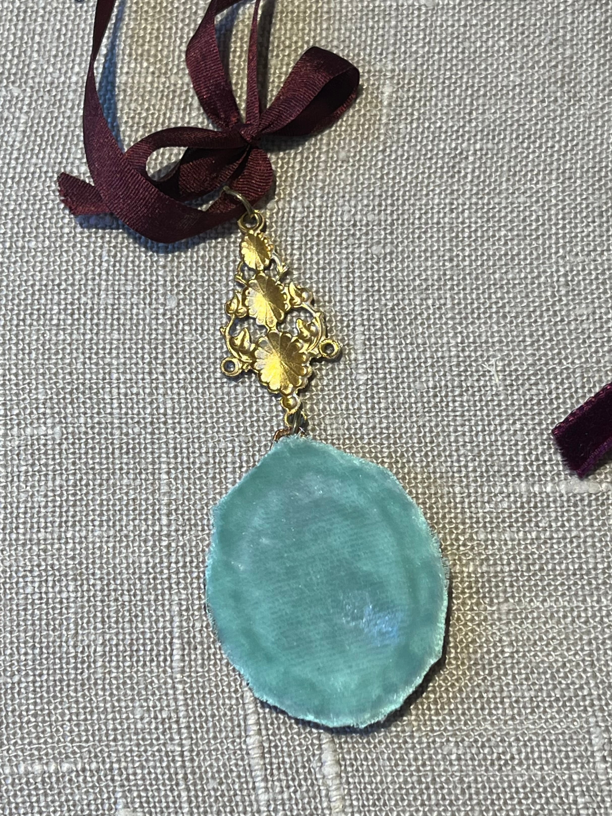 縁には、シードパールを思わせるガラスパールを一粒ずつ並べて、控えめながらも奥行きのある表情に。アンティークのペンダントを思わせる佇まいが、静かな物語を感じさせます。