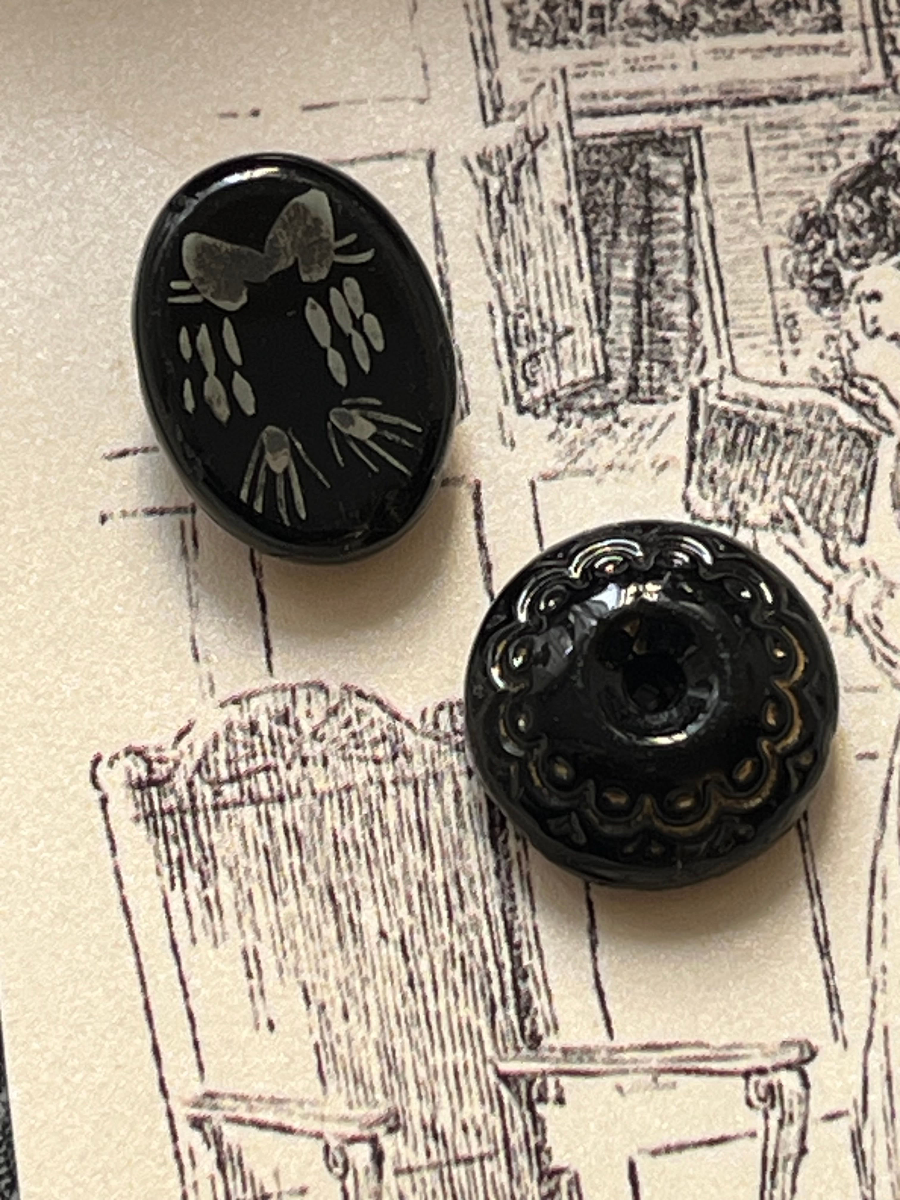 深みのあるブラックに、繊細でガーリーなモチーフが描かれたヴィンテージボタン。