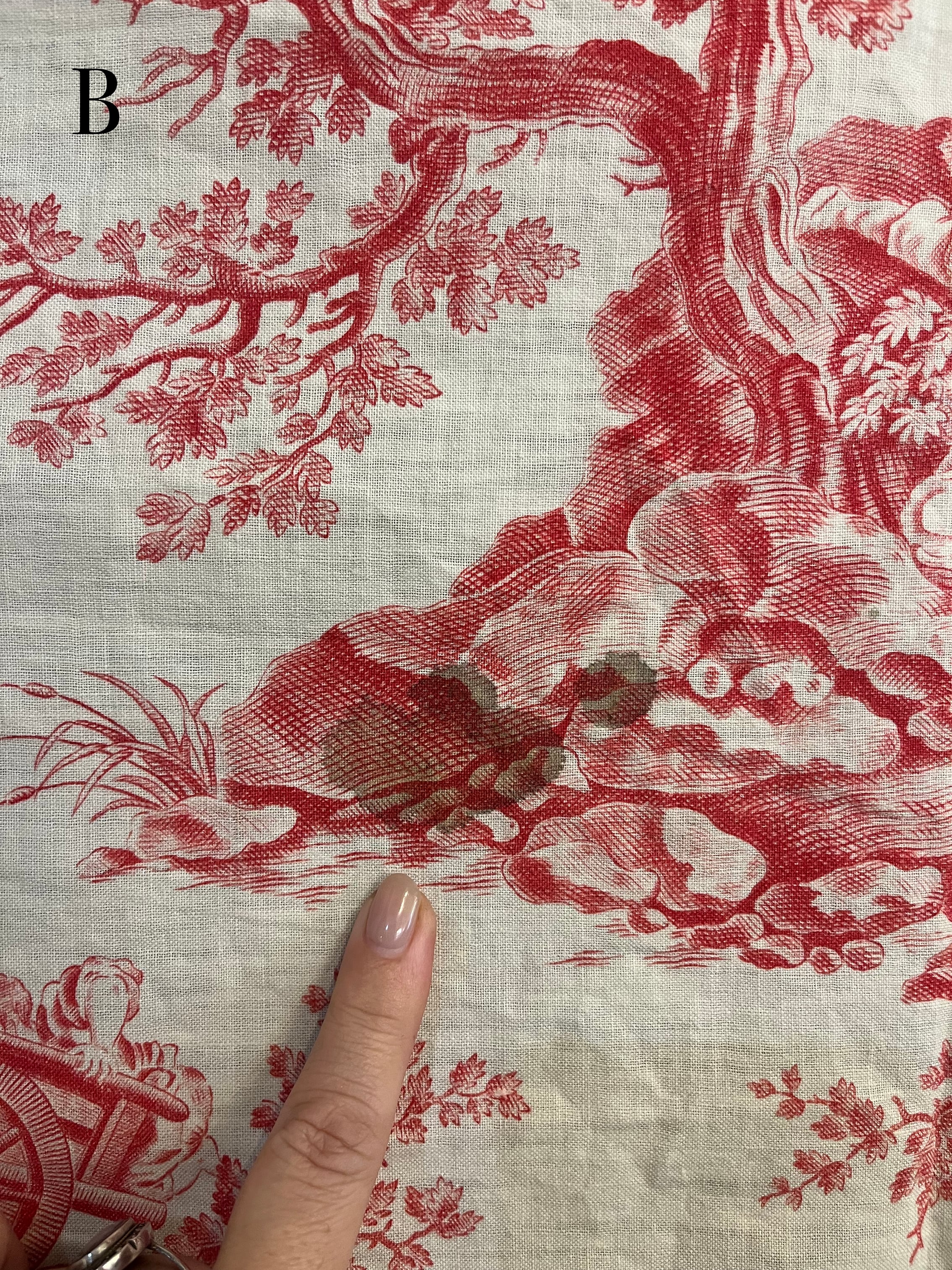 実際に18〜19世紀のトワル・ド・ジュイでは、茜(あかね)などの天然染料を用いた赤が代表的な色として多く生産されており、その伝統は20世紀初頭の生地にも受け継がれています。赤はフランスの室内装飾において特に人気があり、当時の暮らしの中で長く愛されてきた色とよく聞きます。