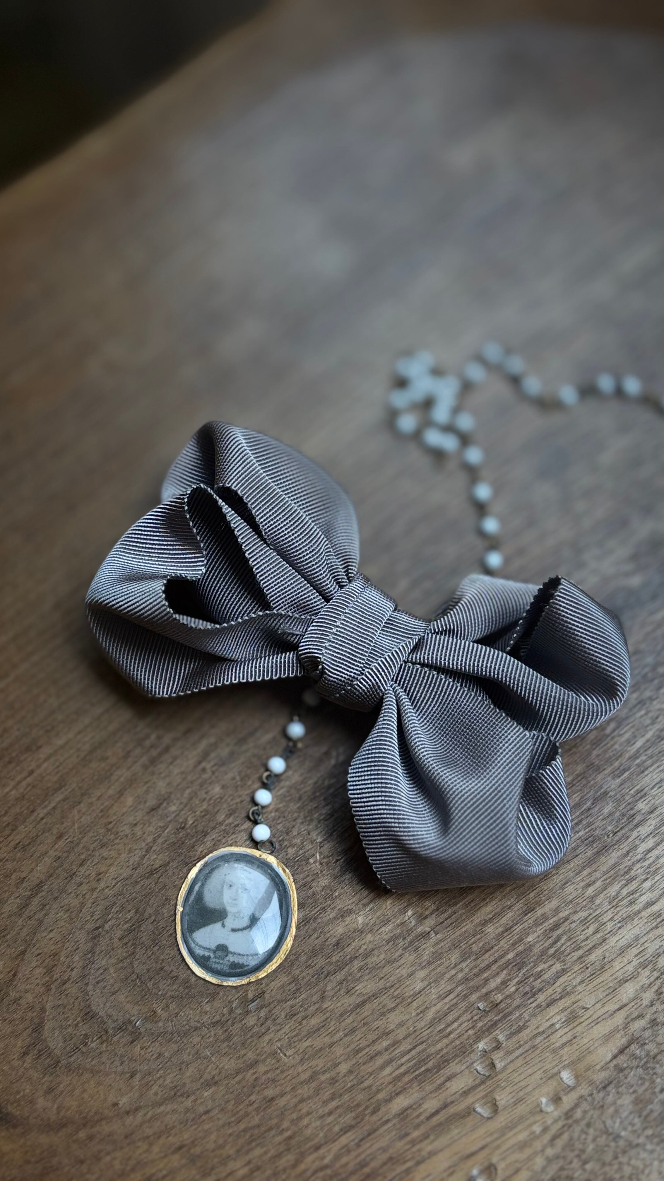 画像4枚目は他の色、クリムゾンとグレージユと撮影したもの。画像5枚目は、グレージュでリボンを仕立てたものです。