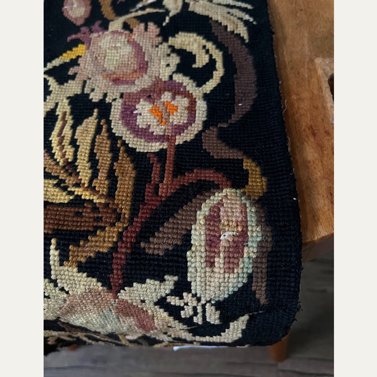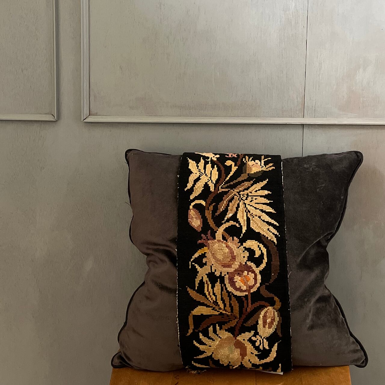 黒地に淡い藤色とクリーム色のウール刺繍糸を使用して製作されています。