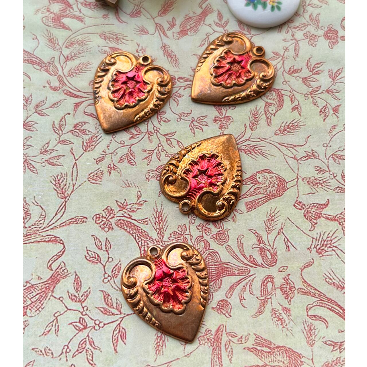 ハートの内側に施された繊細な彫刻が美しく、土台のコッパーカラーと中央の赤い色味が見事に調和しています。バレンタインプレゼントのラッピングにチャームとして添えても良いポイントになるアイテムです。990